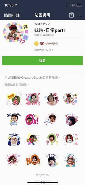 上架後跟一般原創貼圖一樣需要購買才能使用,像 ABBY 一組 8 張的是 line點數50,